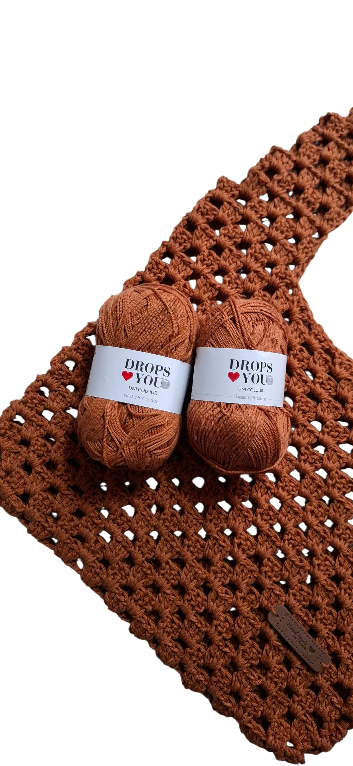 Feita com as linhas DROPS Love You 7 (cor 34) , esta bolsa combina textura, resistência e charme natural, ideal para acompanhar-te nos dias relaxados — da feira ao café de domingo